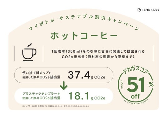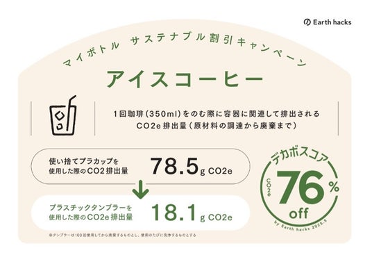 マイボトルで神山湧水珈琲を飲用した場合のデカボスコアは、アイスが76%、ホットが51%という結果になりました。いずれもプラスチック製のタンブラーをご持参頂いたケースを想定し、使い捨ての容器で飲用する場合と比較した削減率となっています。