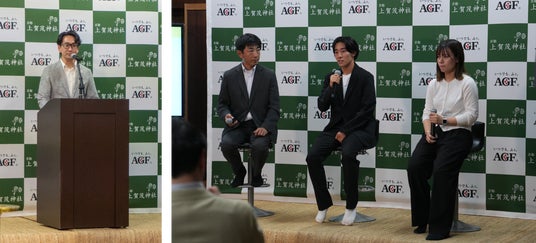 (左)Earth hacks代表取締役 関根澄人によるスピーチ/(右)左から 大阪公立大学 平井教授、デカボアンバサダー島俊輔さん、田中寿美礼さん