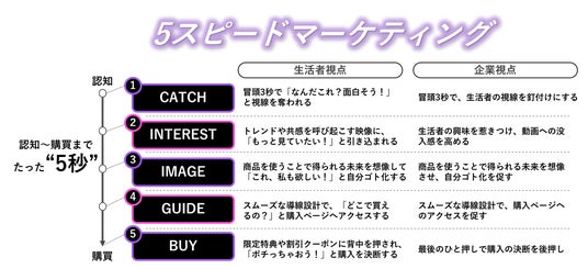 5秒以内に生活者の心を掴み即座に購買行動につなげる独自モデル「5スピードマーケティング(TM)」を活用し、分類された型から施策を作り、結果をもとにスピード重視でPDCAを回します。本モデルは、TikTokのショート動画制作やライブコマース*²におけるHakuhodo DY ONEの豊富な支援実績をもとに開発しており、独自のプランニングナレッジやTikTok Shopの媒体アルゴリズムを踏まえた戦略および制作物の提供が可能です。