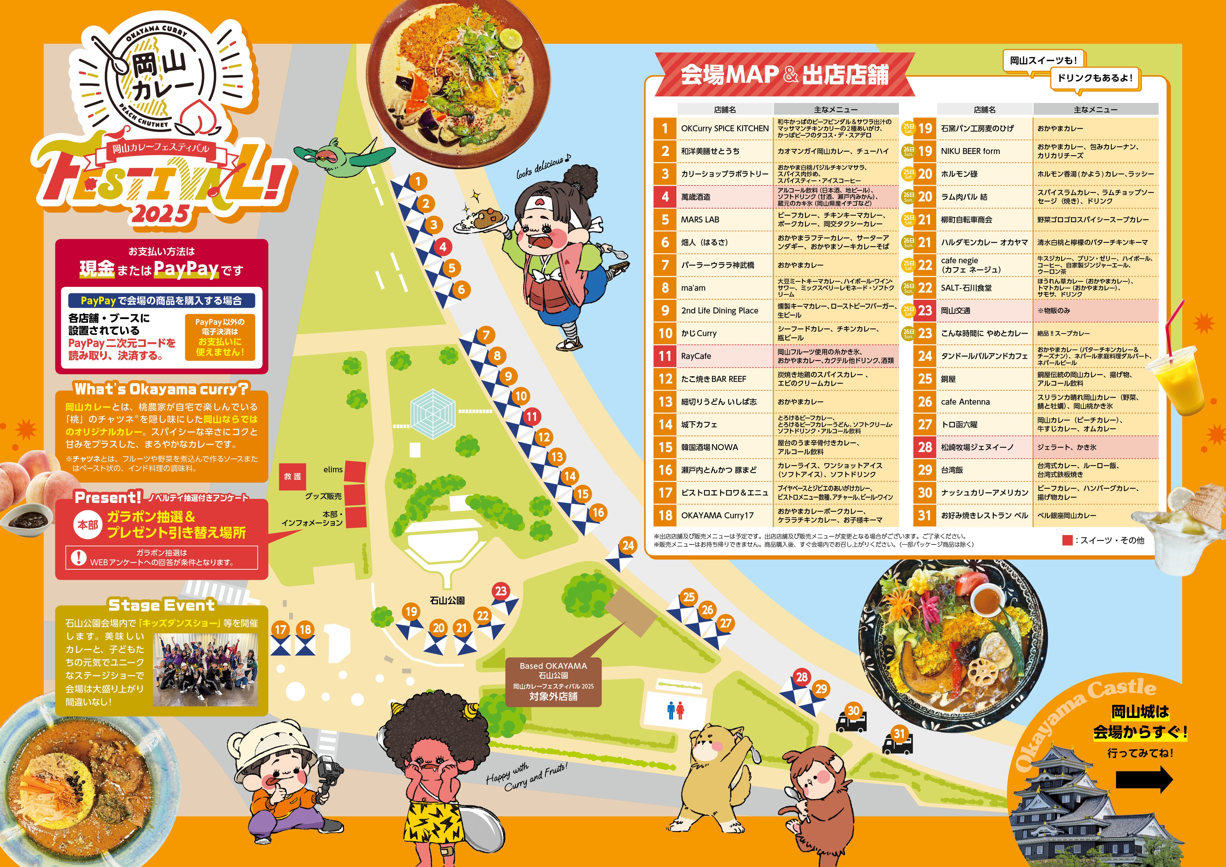 岡山城にほど近い優れたロケーションを有する石山公園で、「桃のチャツネ」を隠し味に使用した、岡山のご当地カレーである「岡山カレー」が大集合するイベント「岡山カレーフェスティバル2025」を開催します。岡山県産フルーツを使ったスイーツのお店も登場。2日間で約30店舗が集結します。各店舗こだわりの岡山カレーをぜひご堪能ください!