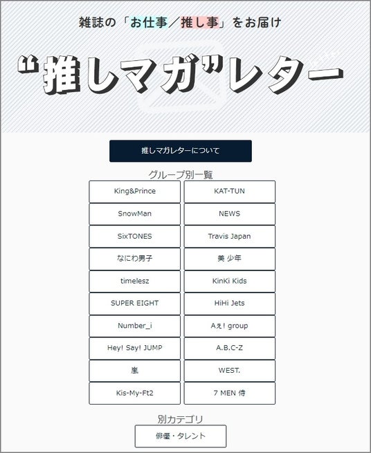 - キーワード(人物名)を選択し「”推しマガ”レター」を申し込むと、その方の雑誌表紙決定のお知らせや雑誌の発売情報、予約開始のお知らせなどをメールで配信