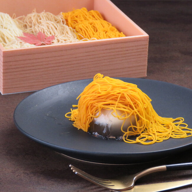 石川県小松市のモンブラン専門店「いも栗カボチャ」が作る1日20個限定の希少スイーツ。つるっとした葛の中に和栗と3種の餡(こし餡・栗餡・カスタード)を入れ、上から熊本産・和栗ペースト、石川産・五郎島金時ペースト、北海道産・カボチャペーストを絞った今までにない新感覚のモンブランです。テレビやSNSでも話題となりました。