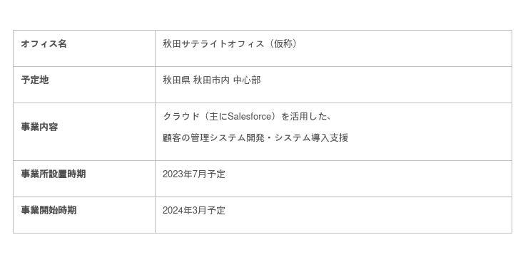 本締結により、2023年7月に秋田市内にサテライトオフィスを新設、2024年3月にはクラウドサービスの導入支援・開発を主体としたクラウドインテグレーション事業を開始予定です。