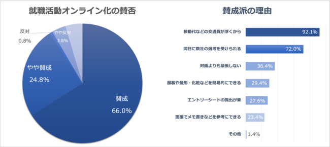 就活がオンライン主体となったことについての賛否では「賛成」66.0%、「やや賛成」24.8%で合算した90.8%が賛成派の回答をしました。またその理由については「移動などの交通費が浮くから」が92.1%で、「同日に数社の選考を受けられる」が72.0%の回答が上位2つの結果になりました。