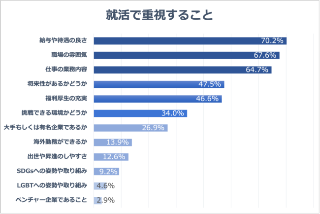 就活の企業選定で重視していることについては、「給与や待遇の良さ」が70.2%と最多回答で、次いで「職場の雰囲気」67.6%、「仕事の業務内容」64.7%が上位3つの回答でした。