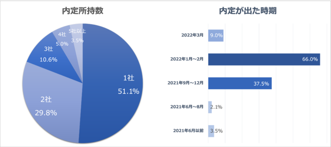 内定が出ていると回答した方の内定数については「1社」が51.1%と最多回答で、次いで「2社」29.8%、「3社」10.6%という回答結果になり、4社以上は8.5%でした。