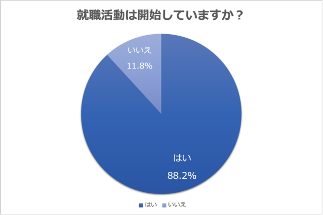 23年卒の就活状況について、全体の88.2%が就活を開始していると回答し、就活を始めた時期については、39.4%が「2021年6月より前」で「2021年6月~8月」が38.5%、「2021年9月~12月」が13.0%という回答結果になり、合算した90.9%が昨年中に就活を開始していたことがわかりました。