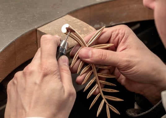 パルム・ドールの製作には、70時間以上もの緻密な作業が必要とされます。2014年以来、ショパールの取り組みである「サステナブル・ラグジュアリーへの旅」プログラムの一環として、トロフィーのゴールドにはエシカルゴールドが使用されています。最高水準の社会的・環境的基準に基づいて採掘された118グラムのゴールドは、6人の熟練職人の手によって加工されます。製造には、「ロストワックス」鋳造法による鋳型の製作、900℃の高温でのゴールドの溶解作業など、数多くの工程が含まれ、そのすべてがショパールの工房で行われています。