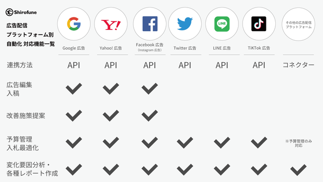 Shirofuneは主要広告プラットフォームの運用業務の効率化・生産性向上と広告効果の最大化を同時に実現する、広告運用自動化ツールです。プロの広告運用技術を再現するシステムで日々の運用業務全般を自動化可能で、経験を問わず広告運用で成果が出せます。現在、10,000を超えるアカウントがShirofuneを通じて運用が自動化されており、延べ20万回以上の広告改善操作が実行されています。