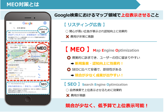 MEOとは、Map Engine Optimization(マップ検索エンジン最適化)の略で、Google検索におけるマップ領域(=Googleマップ)で上位表示させるための施策のことです。