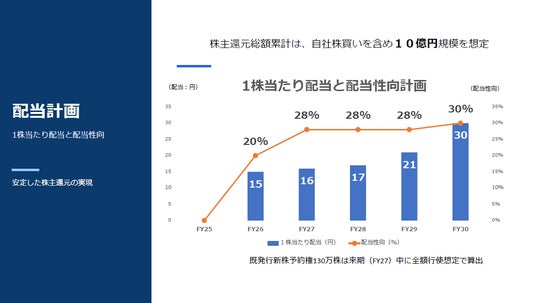 2026年3月期から初配として1株当たり15円の配当(配当性向20%)を開始し、累進配当を基本として、2030年3月期においては、配当性向30%を目指す計画としております。