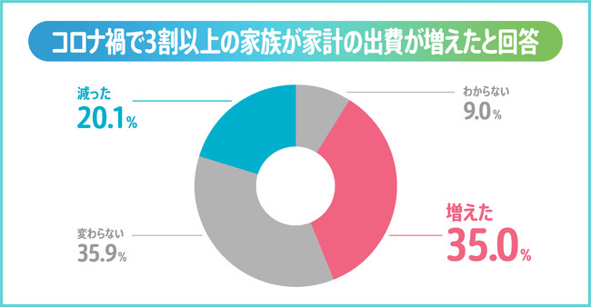 コロナ禍による家庭の出費の変化について、出費が増えたという回答が35%と3割以上の家庭の出費が増えていることがわかりました。反対に出費が減ったと回答したのは2割と、コロナ禍により家庭の出費が増えたと感じる家族が多いことがわかりました。