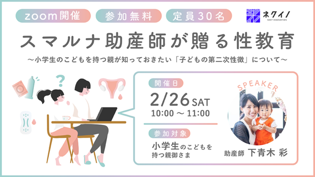 株式会社ネクイノ(大阪市北区、代表:石井健一)が運営するオンライン診察でピルを処方するアプリ「smaluna (※1)」(以下 スマルナ)にて、スマルナ相談室に所属する助産師によるイベント「スマルナ助産師が贈る性教育」シリーズvol.2を2022年2月26日(土)に開催いたします。Vol.1では「幼少期から家庭でできる性教育」をテーマに開催し、総勢約50名にご参加いただき、「正しい知識を専門家から教えてもらえてよかった」「すぐに実践できそうな内容ばかりでとても勉強になった」などご好評の声を数多くいただきました。今回のvol2では、生理や射精などからだに大きな変化をもたらす「第二次性徴」をテーマに実施いたします。