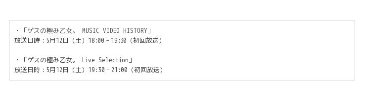 ・番組放送: 『MTV Unplugged: Gesu no Kiwami Otome.』5月12日(土)21:00-22:00(初回放送)
