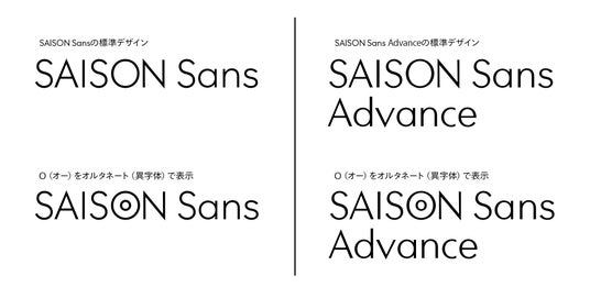 SAISON Sans/Advanceの両方において、クレディセゾンのロゴタイプで象徴的な存在となっている二重丸の「O(オー)」のオルタネート(異体字)も用意されています。田中一光氏のデザインアイデンティティは、この書体にもしっかりと継承されました。