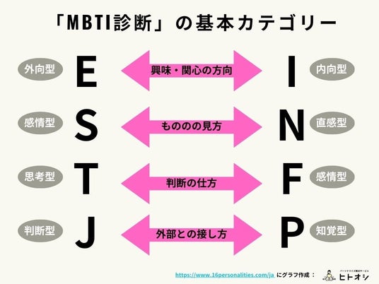 近年「MBTI診断」が日本でも注目を集めています。特に2022年頃からZ世代(1990年代半ば~2010年代序盤に生まれた世代)を中心に、ネット上で手軽に受けられる自己診断ツールとして人気が高まっています(*2)。ヒトオシでも、会員の方々に「MBTI診断」の結果を共有していただいており、プランナーによるマッチング判断の一助としております。
