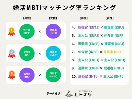 - 1位は、「仲介者(INFP)」の男性と「建築家(INTJ)」の女性の組み合わせで、ヒトオシの平均マッチング率が約50%の中で71.43%と高いマッチング率を記録。