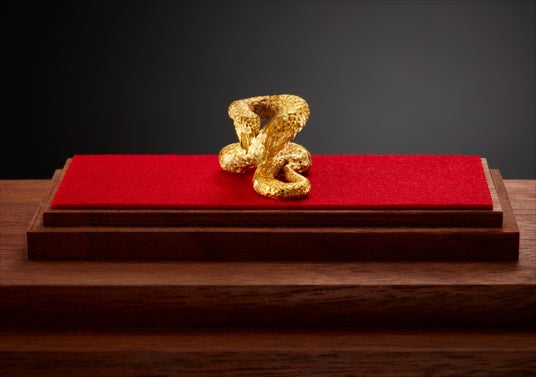 ■純金置物 「蛇」ヘビは金運、繁栄の象徴に加えて、「家の守り神」ともされています。力強く躍動感ある姿を、胴体の柔らかな曲線や動きの細部にまでこだわることで表現した純金の置物です。巳年が豊かな一年になるよう願いを込めて製作しました。