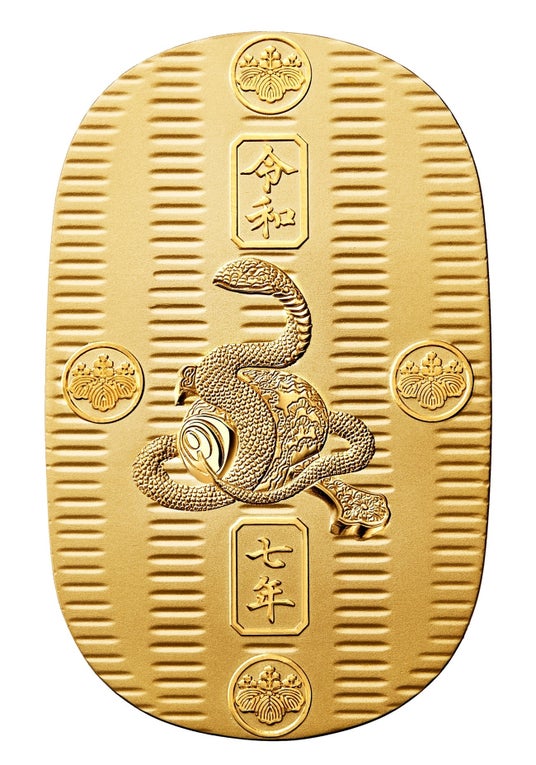 ■純金大判 巳 「令和七年」 200g 純金200gを使用した大判の中心に、振ると富や宝がなど出てくるとされる打出の小槌に乗ったヘビ(巳)を配したデザインです。ヘビは富や金運の象徴とも言われており、縁起の良い逸品です。