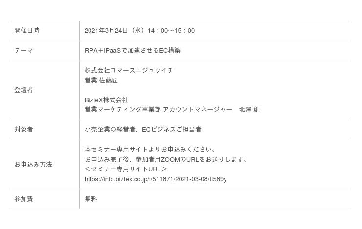 なお、この度の連携を記念して「RPA+iPaaSで加速させるEC構築」をテーマにオンラインセミナーを共催いたします。