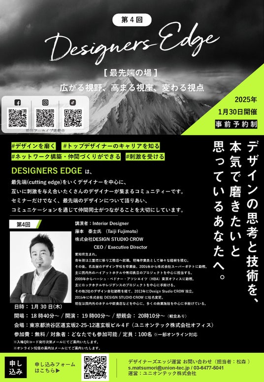 オフィスや商業施設を中心とした空間づくりをワンストップで行うユニオンテック株式会社(本社:東京都渋谷区 代表取締役社長:大川 祐介 以下、ユニオンテック)は、空間設計デザイナーを対象とした成長支援コミュニティ「Designers Edge(以下、デザイナーズエッジ)」の第4回イベントを2025年1月30日(木)に開催いたします。ゲストには株式会社DESIGN STUDIO CROW 藤本泰士氏をお迎えし、デザインにかける情熱とこれまでのキャリアを紐解き、これからのデザインの可能性について語ります。