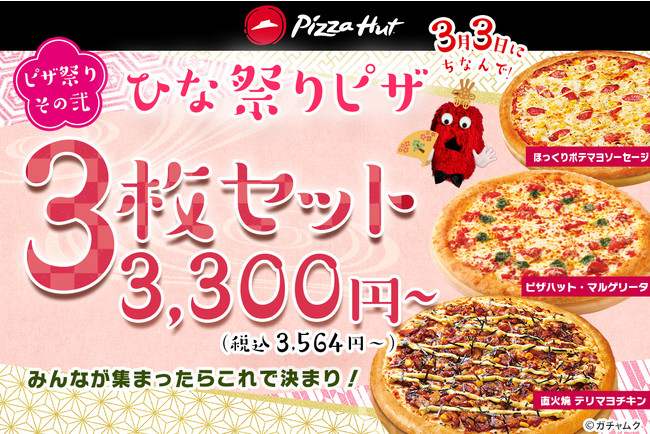 ピザハットの人気ピザ3枚が「ひな祭りピザ3枚セット」に!1枚目は、厳選した鶏もも肉をピザハット特製の生姜醬油たれでしっかりと味付けし香ばしく焼き上げたテリヤキチキンがたっぷりの「直火焼テリマヨチキン」、2枚目は、ほのかに甘いホールトマト、香り豊かなバジルソース、チーズというシンプルながらも味に絶対の自信を持つピザハットの看板メニュー「ピザハット・マルゲリータ」、3枚目は、大きくボリューム満点の国産のじゃがいもをふんだんに使用し、食感にこだわって開発した逸品「ほっくりポテマヨソーセージ」のセットで、「ピザ祭りセール♪」の今だけひな祭りの3月3日にちなんで3,300円(税込3,564円~)でおトク!