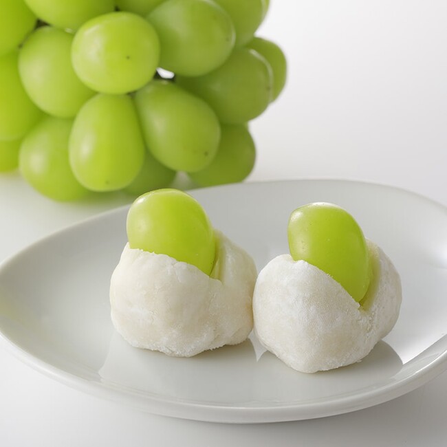 マスカットの果汁を使用した大福にシャインマスカットをはさみました。シャインマスカットの果実のフレッシュ感と大福の甘味がとてもよく合います。