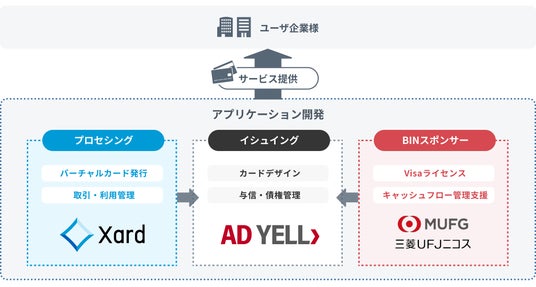 「AD YELL」の法人カード発行にあたり、三菱UFJニコス株式会社(以下、「三菱UFJニコス」)がVisaライセンスを提供するBINスポンサー(※2)となり、同社はVisaとの資金精算等のキャッシュフロー管理等においても支援を行います。なお、「Xard」と三菱UFJニコスとのBINスポンサー連携は今回が初めてとなります。