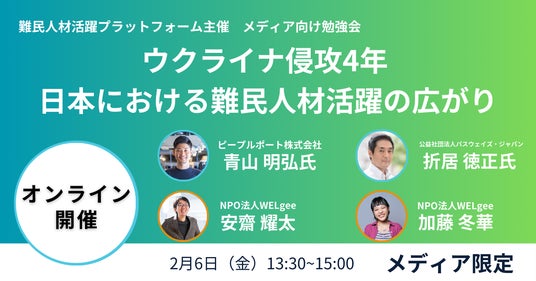 難民人材活躍プラットフォームは、2026年2月6日(金)にメディア向け勉強会を開催いたします。ロシアによるウクライナ侵攻から4年が経過する中、日本で暮らす避難民・難民の現状と、日本企業における難民人材の活躍事例を共有いたします。