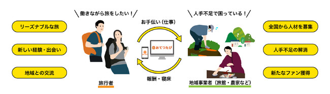 おてつたびは、「お手伝い」と「旅」を掛け合わせた造語で、短期的・季節的な人手不足で困っている地域の方々(農家や旅館など)と、地域に興味がある方々が出会えるマッチングプラットフォームです。人手不足を人と人との出会いのチャンスに変え、誰もが気軽に“知らなかった地域”を訪れることで、地域や事業者のファンになって欲しい!そんな想いから生まれたサービスです。お手伝いを通じて、現地の人と時間を共有し、共に汗を流すことで地域のファンになり、日本各地に人と想いとお金が巡る世界を目指しています。