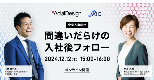 株式会社アーシャルデザイン(本社:東京都渋谷区、代表取締役CEO:小園翔太、以下「当社」)は、株式会社ジェイックと共催で企業人事向けウェビナー「間違いだらけの入社後フォロー」を2024年12月12日(木)15:00より開催いたします。