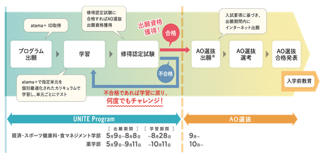 本プログラムは、入学後の学部での学びにおいて、特に重要とされる指定単元をAI教材「atama+(アタマプラス)」で学習し修了することでAO選抜への出願資格が得られるもので、これまでにない形のAO選抜チャレンジメソッドです。