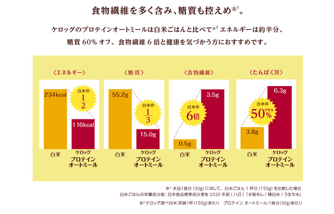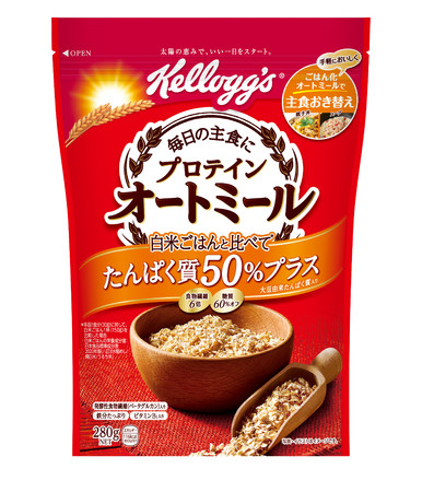 2021年4月に発売した「ケロッグ オートミール」は、コロナ禍で在宅時間増加や健康意識向上を背景に、短時間で手軽にアレンジでき、栄養価が高くヘルシーなご飯などの主食代わりになるといった点が高く評価され、大変ご好評いただいております。今回、新たに新発売する「ケロッグ プロテイン オートミール」は、既に発売している「ケロッグ オートミール」の特長と同様に白米ごはんと比べて*「糖質60%オフ」や「食物繊維たっぷり」はもちろん、大豆由来のたんぱく質フレークを加え、「1.5倍のたんぱく質量」に仕上げています。そのため、ダイエットの際に意識されるエネルギー、糖質は抑えつつ、たんぱく質や食物繊維は摂りたいというヘルシーで健康的な食生活を求める方の日々の主食にもピッタリです。