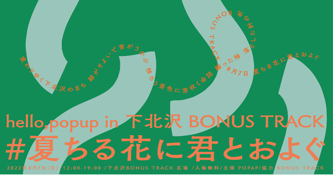 コミュニティ構築支援とポップアップ企画に特化したクリエイティブカンパニー株式会社qutori(CEO:加藤 翼、本社:東京都渋谷区、以下:qutori)は、2022年8月7日に「hello,popup in 下北沢 BONUS TRACK #夏ちる花に君とおよぐ」を下北沢ボーナストラック(東京都世田谷区代田二丁目36番12号~15号)にて開催します。