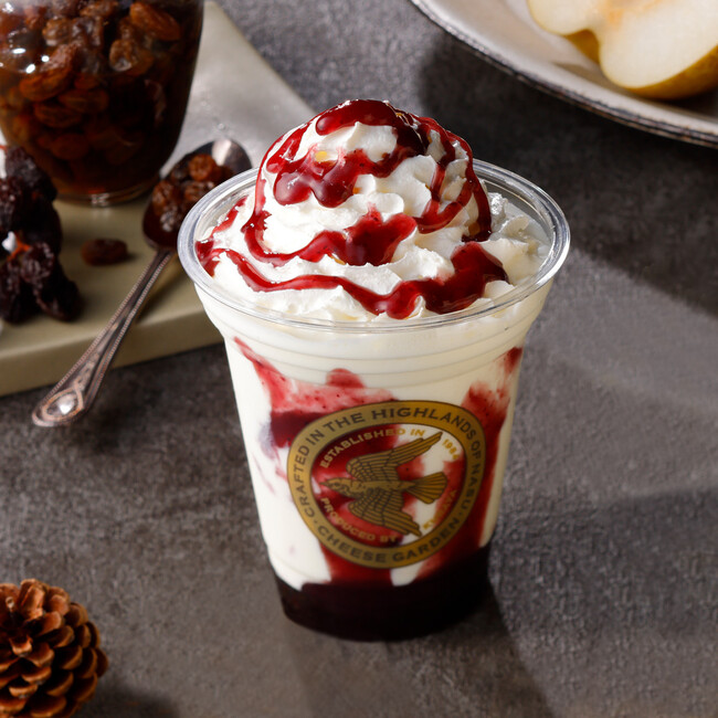 レアチーズケーキの風味が楽しめることで人気のフローズン仕立てのフロマージュドリンクに、レーズンとラム酒のフレーバーを使用した甘美な香りひろがるラムレーズンソースを合わせました。ラムレーズンソースに加え、ブルーベリーソースも使用することでベリーのほのかな酸味がプラスされ、程よい甘さがお楽しみいただけます。また、混ぜ合わせて飲むことで味わいの変化もお楽しみいただけるデザートドリンクです。