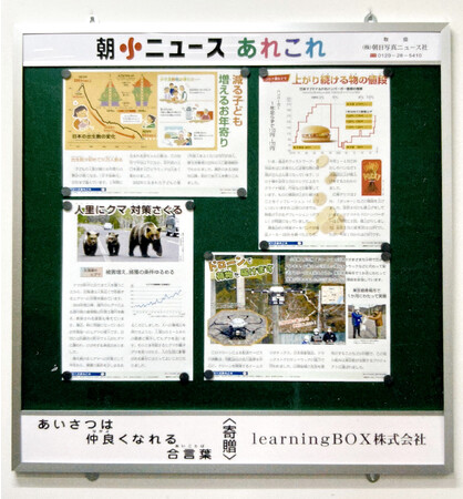 learningBOX株式会社は、世界中で、誰もが、いつでも、どこでも、好きなことを、好きなだけ、自由に学べる社会の実現を目指しています。昨年度に続き「朝小ニュースあれこれ」掲示板を寄贈することとなり、子どもたちが楽しく見聞を広めつつ、読解力や考える力を培うための一助となることを願っています。