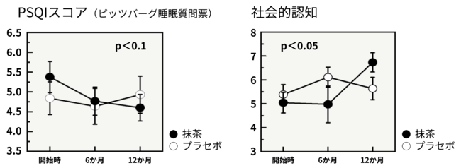 睡眠の質をピッツバーグ睡眠質問票(PSQI)を用いて評価した結果、抹茶群でPSQIスコアが低下し、睡眠の質が向上する傾向が示されました(図・左)。また認知機能に関しては、認知症やMCIのスクリーニング等に用いられる神経心理学的検査(MMSE-J、MoCA-J等)での得点で抹茶群とプラセボ群の間に差はみられませんでしたが、コグニトラックス検査(CNS Vital Signs日本語)による認知機能の領域別の評価では、抹茶群はプラセボ群に比較して、表情認知テストで表される社会的認知、具体的には顔表情からの感情知覚の精度が有意に改善することが確認されました(図・右)。