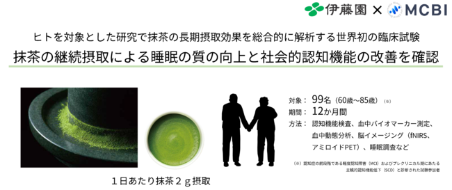 株式会社伊藤園(社長:本庄大介 本社:東京都渋谷区)と筑波大学発ベンチャーの株式会社MCBI(社長:徳美喜久 本社:茨城県つくば市)の2社は共同で、認知症の前段階である軽度認知障害(MCI)と主観的認知機能低下(SCD)の高齢者を対象にした臨床試験「抹茶の認知機能低下抑制効果を評価する試験」を実施し、抹茶を継続摂取することで睡眠の質向上と社会的認知機能の改善を確認しました。本共同研究チームは8月2日(火)、この研究成果をサンディエゴ(アメリカ合衆国カリフォルニア州)で開催されるアルツハイマー病協会国際会議(Alzheimer's Association International Conference:AAIC)(※)2022にて発表しました。