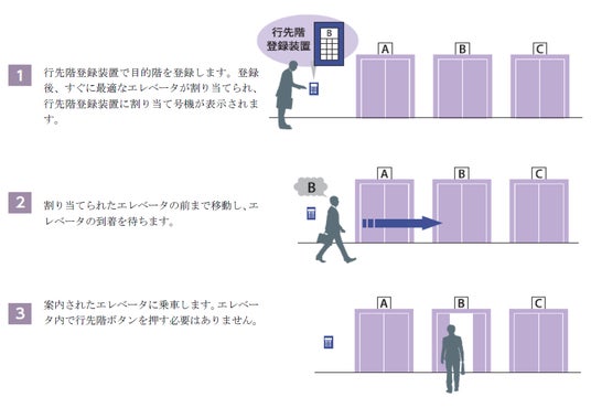 「EZ-SHUTTLE(イージーシャトル)」は、エレベータに乗る前に利用者の目的階を登録し、運行中のエレベータに利用者を最適配分することで、エレベータの台数や定員を増やさずに、運行を効率化する仕組みです。移動時間を最大50%※短縮できます。朝の通勤時間帯などにエレベータ待ちの渋滞が発生しやすい大型オフィスビル向けのシステムです。