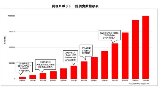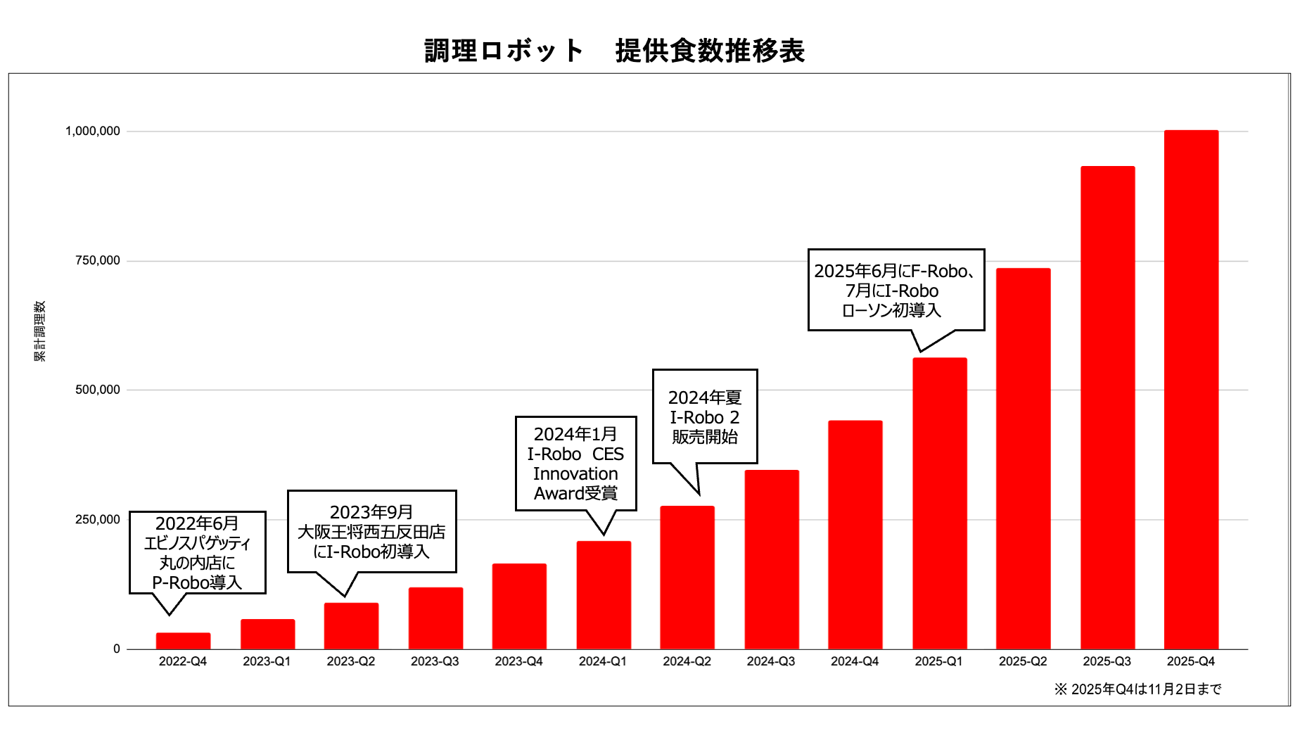 これらのロボットが飲食店・コンビニ厨房・テーマパーク・社員食堂等で提供した食事の累計が、2025年11月時点で100万食を突破(自社調べ)。
