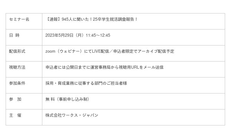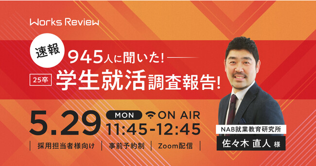 株式会社ワークス・ジャパン(本社:東京都千代田区、代表取締役:清水信一郎、以下 ワークス・ジャパン)は、2023年5月29日(月)に採用・育成業務に従事する部門のご担当者を対象にしたオンラインフォーラム、「【速報】945人に聞いた!25卒学生就活調査報告!」を開催します。参加無料、事前申込制、ZOOMで配信します。