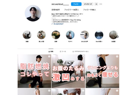 なので「オンラインでもしっかり痩せられるよ」という土台作りをいちインフルエンサーとして発信して、「オンラインパーソナルトレーナーといえばレンさんだよね」のようなところを取りに行きたいなと考えています。