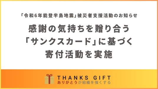 このたび、2024年1月1日に発生した 「令和6年能登半島地震」により被災された地域の皆様の支援や被災地の復興のお役に立てるよう、2月1日から4月30日まで当社内で贈り合うサンクスギフト上でのサンクスカード1枚を「サンクス」の名称にちなみ39円に換算し、石川県に寄付いたします。