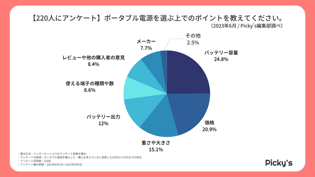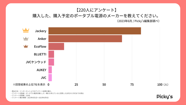 「Picky’s」は、インターネットショッピングにおいて、購入前に試せない・選ぶべきものがわからないという課題の解決を目標に、あらゆる商品のおすすめランキングや検証レビューを紹介するサイトです。このたびPicky’s(https://rentry.jp/note/)では、夏需要に先駆けて、ポータブル電源についてインターネット上でアンケート調査を行いましたので発表いたします。