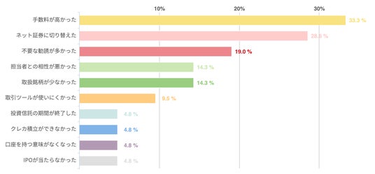 アンケートによれば、取引をやめた理由としては「手数料が高い(33.3%)」が最も多かった。