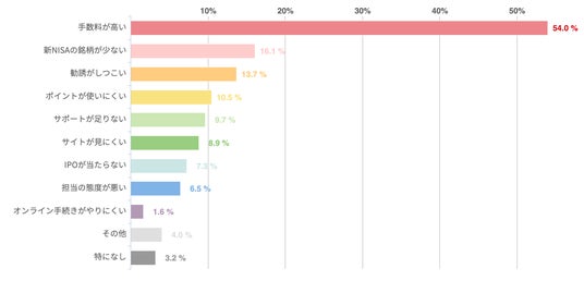 アンケートによれば、「手数料が高い(54.0%)」を不満に挙げた回答者が圧倒的多数を占める結果となった。中でも「手数料をネット証券と同水準にしてもらいたい」といった要望が多く見られた。