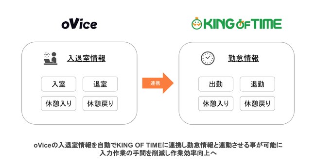 oViceの入退室情報を、API連携によってKING OF TIMEへ自動連携し、勤怠情報と連動させる事が可能となります。
