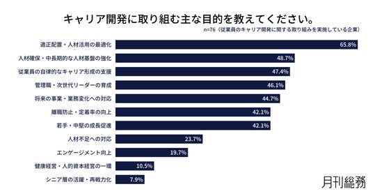 キャリア開発に取り組む主な目的を尋ねたところ、「適正配置・人材活用の最適化」が65.8%で最も多く、「人材確保・中長期的な人材基盤の強化」が48.7%、「従業員の自律的なキャリア形成の支援」が47.4%と続きました(n=76/従業員のキャリア開発に関する取り組みを実施している企業)。
