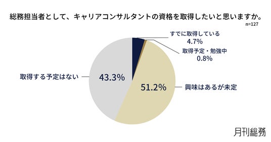 総務担当者として、キャリアコンサルタントの資格を取得したいと思うか尋ねたところ、「興味はあるが未定」が51.2%、「取得する予定はない」が43.3%と、ほとんどが具体的な動きに至っていないことがわかりました(n=127)。