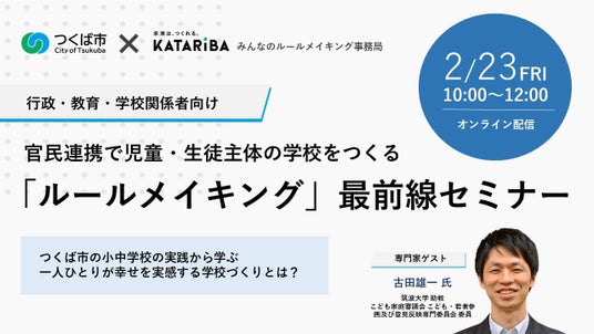 認定特定非営利活動法人カタリバ(本部:東京都杉並区、代表理事:今村久美、以下カタリバ)が運営する「みんなのルールメイキング」は、つくば市教育委員会と共催で、茨城県つくば市で取り組んでいる児童・生徒主体の学校づくりを行う「ルールメイキング」の取り組みの実践報告と、官民連携によるルールメイキングの可能性について語るオンラインセミナーを2024年2月23日(金・祝)に開催します。イベント開催に合わせて、行政・教育・学校関係者の観覧募集を開始する他、報道関係者へ公開することとなりましたのでお知らせします。